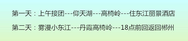第二天:東江湖景區一霧漫小東江一高椅嶺--郴州送團早起酒店出發前往東江湖售票廳換乘景區車到霧漫小東江6:30-9:30,景區有安排漁夫撒網表演哦。觀后沿小東江觀霧棧道往上游走到3號或者4號站臺,繼續乘坐景區環保車前往終點站--東江大壩旅游碼頭。抵達大壩后可前往【龍景峽谷瀑布群】(參考時間約1.5小時龍景峽谷全線游程2.5公里。看山景,山勢陡峭,青山滴翠,古木參天;觀水景,一條清澈的溪流在峽谷中穿行,瀑布成群沿途可以觀賞到煙竹山瀑布、龍景瀑、龍吟瀑、三疊瀑、龍卷瀑、鴛鴦瀑等形態各異的瀑布和古松坳、連理樹、龍鱗石等干姿百態的景點。
