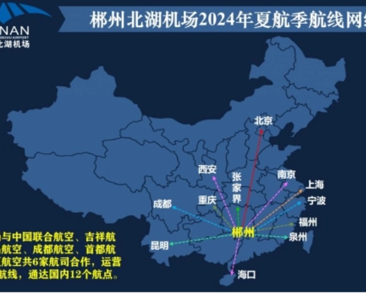 自2024年3月31日(星期日)起,至10月26日止。中國民航開始執(zhí)行夏航季航班計劃。本次航班換季郴州北湖機場恢復了張家界航點。新航季與6家航空公司,合作運營8條往返航線,通達國內(nèi)北京大興、上海浦東、成都天府、重慶、西安、???、南京、福州、昆明、泉州、寧波、張家界共12個航點。